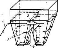 Рис. 1.16. Схема пневмообрушения топлива в бункере: 1 – подвод сжатого воздуха; 2 - ресивер; 3 - сопла; 4 - запорная арматура