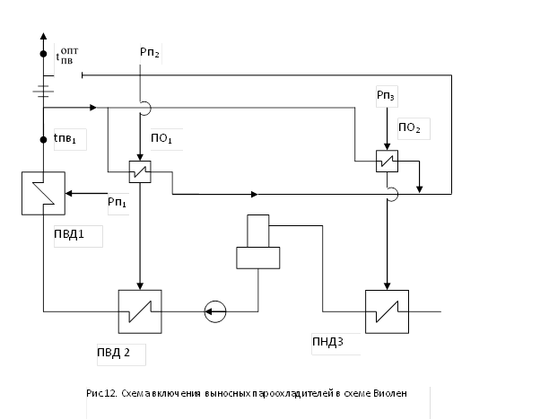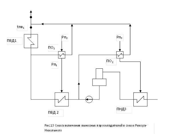 Наличие выносных пароохладителей повышает экономичность установки за счёт снижения  давления Рп1 и большей выработки мощности паром этого отбора. При отсутствии ПО1 и ПО2 должна быть за ПВД1и ей соответствует более высокое давление Рп1. При наличии пароохладителей  за точкой смешения, а за ПВД1 1 tПВ1<Рп1 меньше и выработка мощности этим потоком пара больше.