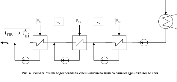 Узловая схема подогревателя смешивающего типа со сливом дренажа после себя