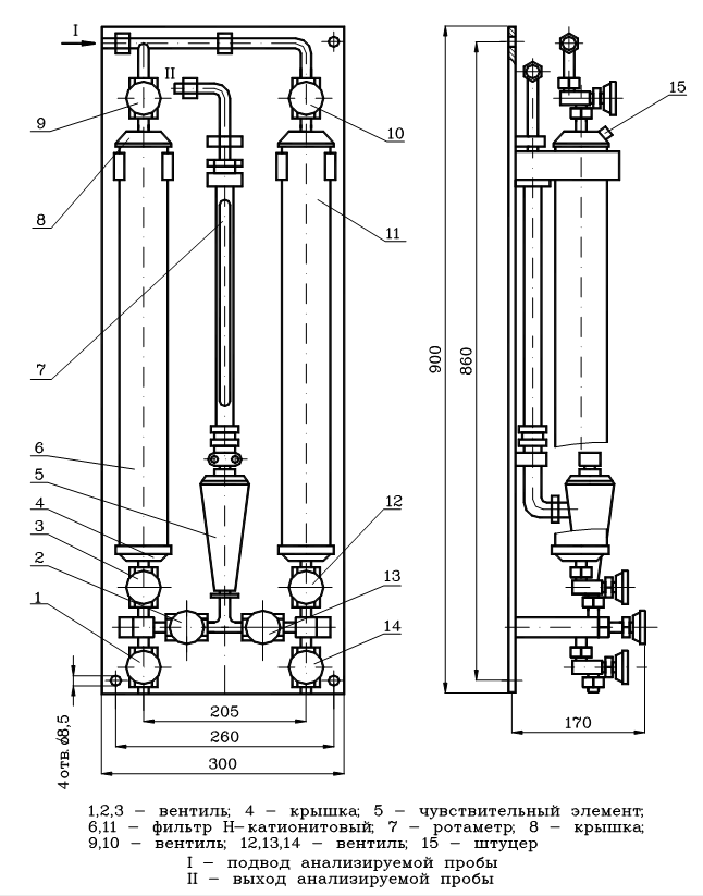 Предвключенный Н-катионитовый фильтр, заполненный ионнообменной смолой марки КУ-2, предназначен для исключения влияния на результат измерения примесей аммиака, гидразина и других аминов. Перед каждым датчиком на общей раме обычно устанавливается по два фильтра: один рабочий, другой резервный (рис. 41). Фильтр представляет собой трубу из нержавеющей стали, закрытую с обеих сторон крышками. Верхняя крышка имеет специальный штуцер для выпуска воздуха при заполнении фильтра водой. Под крышками установлены сетчатые фильтры в виде стаканов из полиэтилена, заполненные стекловатой. Соединение фильтра с чувствительным элементом осуществляется при помощи трубок из нержавеющей стали. Обменный объем смолы составляет не менее 1300 г.экв/м3, что соответствует примерно 6 месяцам работы фильтра при содержании аммиака в воде 0,5 мг/л. Полнота поглощения аммиака и других аминов зависит от скорости фильтрования. Скорость фильтрования устанавливается в пределах 3,6-4,2 л/час., что соответствует расходу контролируемой воды 18-21 л/час.