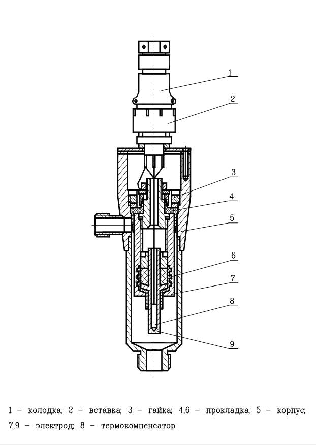 Корпус чувствительного элемента изготовлен из нержавеющей стали. В нем установлены два катионитовых электрода, изолированных друг от друга и от корпуса с помощью фторопластовых прокладок. Каждый из электродов образует с корпусом самостоятельную ячейку, электрическое сопротивление которой подключается к измерительной схеме блока преобразователя нажатием соответствующей кнопки переключателя “0,1” или “1” на передней панели преобразователя для диапазона измерения 0-0,1 или 0-1,0 мСм/см соответственно. Во внутренней полости электрода находится терморезистор, предназначенный для автоматического ввода поправки на показания прибора при отклонении температуры контролируемой воды от градуированного значения 25 оС.