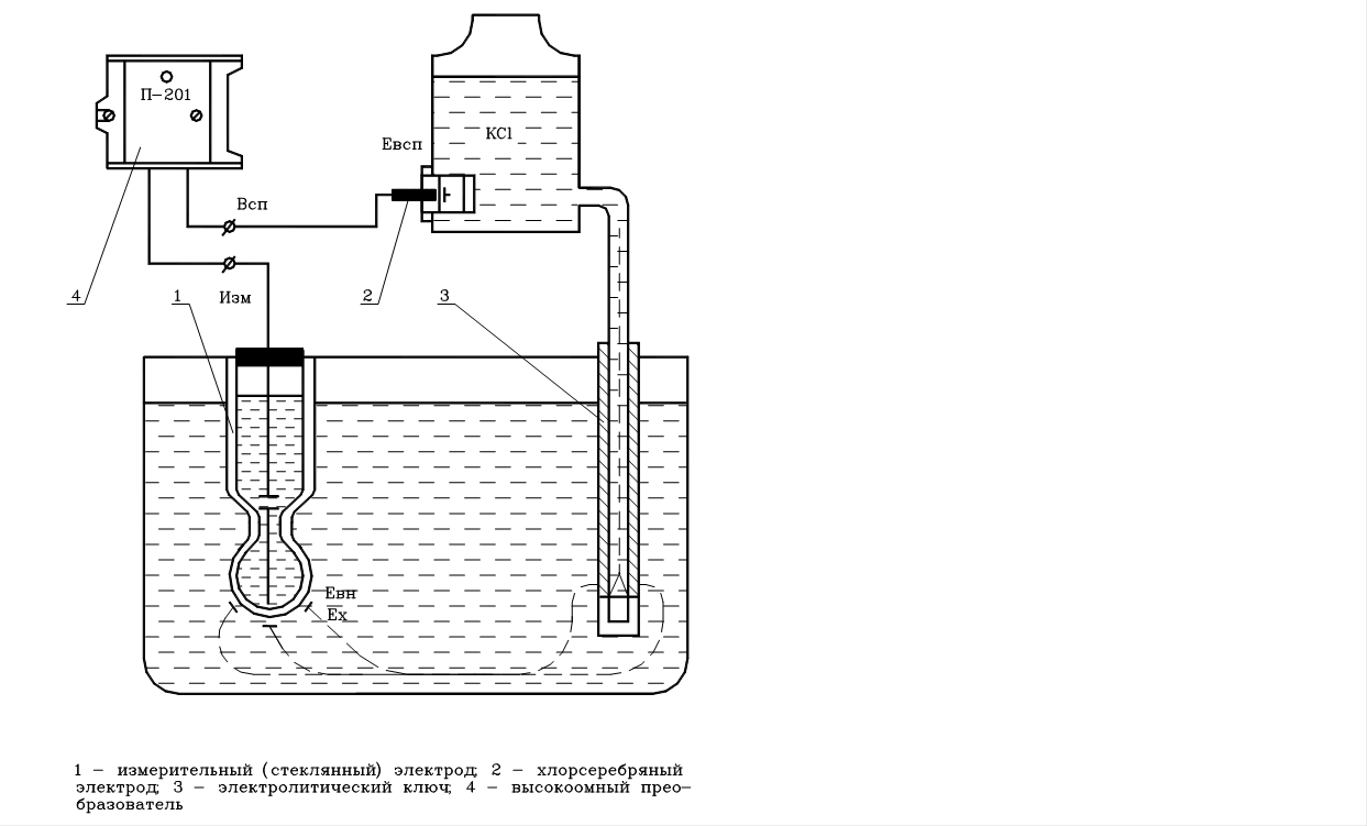 Раствор хлористого калия (KCl) непрерывно просачивается через электролитический ключ, предотвращая проникание из контролируемого раствора в систему хлорсеребрянного электрода посторонних ионов, которые могли бы изменить величину ЭДС этого электрода. Измеряемая часть ЭДС электродной системы определяется потенциалом только измерительного электрода. С помощью высокоомного измерительного преобразователя ЭДС электродной системы преобразуется в выходной ток, измеряемый миллиамперметром, отградуированным в единицах рН.
