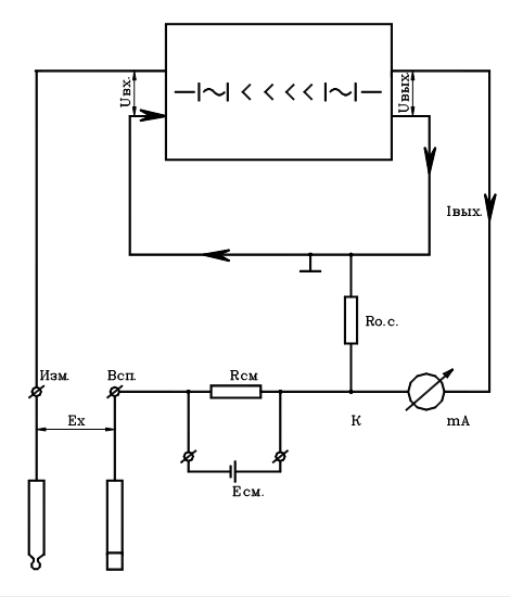 Контакт вспомогательного электрода с контролируемым раствором осуществляется с помощью электролитического ключа, обеспечивающего нетечение насыщенного раствора KCl в контролируемый раствор.