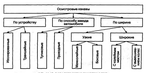 Канавы и эстакады относятся к подъемно-транспортному оборудованию и составляют подгруппу подъемно-осмотрового оборудования. На них возможно проведение работ снизу и сбоку автомобиля (рис. 2.24). Длина канавы должна быть больше длины автомобиля на 0,5-0,8 м. Глубина для легковых автомобилей - 1,4-1,5 м, для грузовых и автобусов - 1,2-1,3 м.