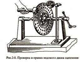 При замене фрикционных накладок возможны случаи коробления ведомого диска. Поэтому ведомый диск с новыми переклепанными накладками следует проверить на отсутствие коробления. Способ проверки показан на рис.2-9. Допускается биение ведомого диска не более 1,0 мм, а неплоскостность не более 0,5 мм. Если биение превышает указанную величину, ведомый диск следует править специальным захватом, как показано на рис.2-8.
