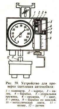 Устройство для проверки сцепления автомобилей (рис. 59) служит для определения технического состояния и эффективности действия сцепления автомобиля, которое состоит из измерителя силы и указателя хода педали. Измеритель силы включает манометр 1, датчик 12 с захватом для фиксации на педали сцепления и гибкий шланг 11.
