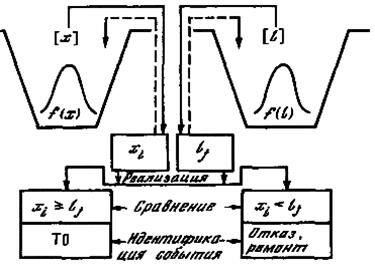 Идентификация события происходит при каждой реализации и сравнении пары случайных величин: при хj< lj фиксируется отказ, а при lj < xi - предупреждение отказа путем выполнения профилактической операции.
