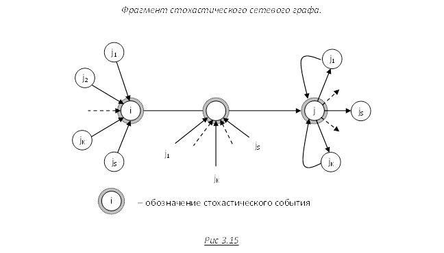 , из которой имеется возможность возвратиться в вершину с меньшим номером, последовательность случайных чисел, принимающих с заданными вероятностями значения, равные номерам вершин, в которые предписано возвратиться. Для случая ЭМР на детерминированном сетевом графе отмечаются стохастические события, начало выполнения которых зависят от факторов готовности к началу ЭМР, определенных в п. 3.7.2. Пусть вершина i включает предшествующие события