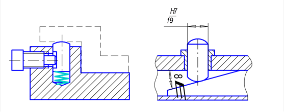 Головка плунжера 1 при освобожденном винте 3 под действием пружины выступает несколько над тремя основными опорами при установке детали. Она силой своего веса опускает плунжер и устанавливается на основные опоры. После закрепления детали плунжер стопорится винтом 3, превращаясь в основную опору. Сила пружины должна быть такой, чтобы установленная на три основные опоры, но не закрепленная деталь не приподнималась плунжерами. Угол скоса a должен быть самотормозящим (6 - 10°), т.к. в противном случае при стопорении он может подниматься вверх и приподнимать деталь с основных опор.