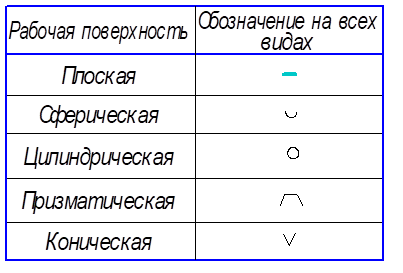 Обозначение формы рабочих поверхностей наносят слева от обозначения опоры, зажима или установочного устройства.