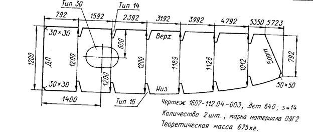 — эскизы деталей, необходимые при выполнении различных операций, связанных с процессом их изготовления. Эскиз разрабатывают на каждую деталь или ее заготовку. При вычерчивании эскизов деталей вручную соблюдение масштаба не требуется. На эскизах наносят размеры детали, ориентирные надписи (верх, низ, нос, корма, борт, к ДП и т. п.), указывают вид и размеры разделки кромок под сварку, расположение и размеры припусков, номер детали по чертежу, марку материала и др. На рис. 3.1 в качестве примера приведен эскиз флора;