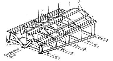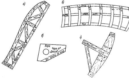 Каркасы изготавливают на плазе для проверки формы наиболее сложных деталей во время и по окончании их гибки. Каркасы собирают из отдельных деревянных поперечных шаблонов, скрепленных между собой продольными рейками. На рис. 3.6 видно, что рабочая поверхность каркаса образуется как поперечными шаблонами, так и расшивинами (продольные рейки), врезанными в шаблоны вровень с их лекальной кромкой. Если плоскость основания каркаса (базовая плоскость) перпендикулярна к ПМШ, то для его изготовления нужно расставить поперечные шаблоны на расстоянии шпации друг от друга и в таком положении закрепить их. Для уменьшения высоты каркасов часто изготовляют так называемые усеченные каркасы, базовая плоскость которых не перпендикулярна ПМШ. Она выбирается так, чтобы высота поперечных шаблонов оказалась примерно одинаковой.