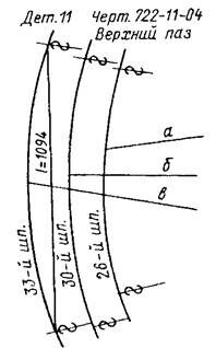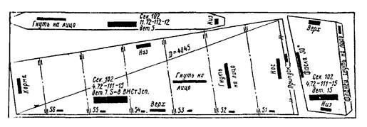Гибочные шаблоны – поперечные и продольные – предназначены для проверки формы изгибаемой заготовки детали в процессе и по окончании ее гибки. Шаблоны прикладывают к заранее размеченным на заготовке контрольным линиям и но прилеганию к поверхности изгибаемой заготовки судят о соответствии се формы требуемой. Контур поперечного шаблона снимается с натурного плаза без каких-либо построений, так как рабочая кромка шаблона повторяет обвод шпангоута. Однако при масштабной разбивке необходимо контур шаблона из М 1:10 перевести в масштаб 1:1. Нa рис. 3.3 приведен участок плазовой разбивки, который нужно перенести на гибочный шаблон натуральной величины. С разбивки линии отдельных сечений переносят на деревянные заготовки. Правильность расположения сечений фиксируют с помощью дополнительных контрольных линий. Последовательность действий следующая: линии разбивки копируют на прозрачную пленку, которую фотографируют, а негатив проецируют на деревянную заготовку, учитывая масштаб; все световые линии по гибкой рейке обводят карандашом и обрезают по карандашу, еще раз проверяя правильность лекальной кромки по световому контуру. Контур в натуральную величину можно вычертить и по точкам, координаты которых сняты с масштабного плаза в табличном виде с эскизом.