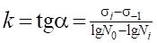 Угол наклона прямой линии в левой части кривой усталости зависит от марки стали, то есть от свойств материала. В полулогарифмических координатах (см. рис.2) параметр k, характеризующий интенсивность изменения долговечности при переходе от одного уровня напряжений к другому, определяют как