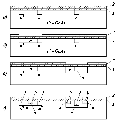 Рисунок 1.16 - Структура комплементарных полевых транзисторов с управляющим переходом и последовательность технологических операций ее изготовления: 1 -