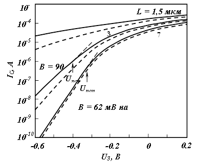 Здесь небольшой сдвиг характеристик при изменении Vc наблюдается уже в приборе с L = 7 мкм. В МОПТ с каналом длиной 3 мкм подпороговые токи и соответствующие S существенно увеличены. И, наконец, характеристики прибора с самым коротким каналом (L = 1,5 мкм) кардинально отличаются от характеристик обычных длинноканальных приборов (прибор «не выключается»).