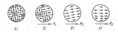 При усилении поля картина намагничивания изменяется: векторы намагниченности всех доменов постепенно, по мере усиления поля, поворачиваются в направлении поля в энергетически более выгодное положение (рисунок 4.1). В этом процессе участвует преобладающая часть доменов, поэтому намагниченность образца изменяется значительнее и второй участок кривой намагничивания идет более круто по сравнению с первым (рисунок 4.4), При возвращении к начальному значению поля доменная структура уже не возвращается к исходному состоянию, и образец сохраняет какую-то намагниченность в направлении поля. Второй этап намагничивания происходит необратимо, и его называют необратимым процессом смещения границ доменов.