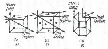 трех основных ферромагнитных элементов: железа, никеля и кобальта. Железо и его сплавы Fe-Ni, Fe-Si кристаллизуются в кубической структуре и осями легкого намагничивания у них являются ребра куба, а самого трудного - пространственные диагонали. Для никеля, имеющего также кубическую структуру, распределение осей намагничивания противоположное. Направления легкого и трудного намагничивания кристалла кобальта, имеющего гексагональную структуру, показаны на рисунке 4.2, в.