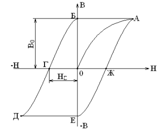 При уменьшении Н до нуля в материале сохраняется некоторая остаточная магнитная индукция Во (отрезок ОВ). Чтобы полностью размагнитить материал необходимо создать внешнее магнитное поле обратного направления. Тогда при некотором значении Нс (отрезок ОГ), индукция в образца равна нулю – образец размагничен. Величину Нс называют задерживающей или коэрцитивной силой. Если продолжить намагничивать образец, то можно довести его до насыщения (точка Д), а при уменьшении Н вновь наблюдается гистерезис, и при Н=0 возникает отрицательная остаточная индукция (отрезок ОЕ), и для ее устранения необходимо создать Нс (отрезок ОЖ). Таким образом перемагничивание происходит по кривой АБГДЕЖА. Площадь и форма этой кривой различна для разных материалов. Магнитомягкие материалы перемагничиваются относительно в слабых полях Н до сотен А/м и характеризуются высокими значениями относительной магнитной проницаемостью и малой коэрцитивной силой.