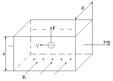 Если поместить металлическую пластинку с током в магнитное поле В, перпендикулярно току, то электроны будут испытывать силу Лоренца, которая направлена вверх, поэтому у верхнего края пластины возникает повышенная концентрация электронов (верхняя часть заряжается отрицательно, а у нижнего – недостаток (заряжается положительно), возникает поперечное электрическое поле, направленно снизу вверх. Когда значение Епопер достигнет и будет уравновешивать силу Лоренца, то установится стационарное распределение зарядов в поперечном направлении, тогда