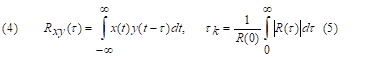 Функция (4) взаимной корреляции двух разных сигналов x(t), y(t) конечной длительности характеризует степень взаимосвязи этих сигналов. Величину (5) называют интервалом корреляции. Значения сигналов, отстоящие друг от друга на интервал времени больше τk, являются практически взаимно независимыми