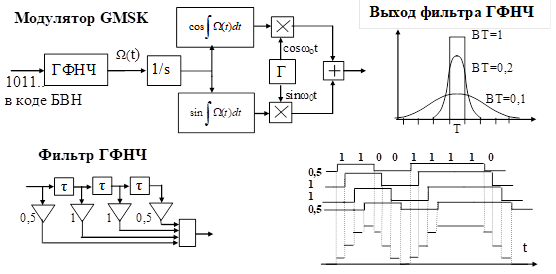 Модулятор содержит два квадратурных канала с несущими частотами, сдвинутыми на π/2 относительно друг друга. Как и в системе MSK, сигналы несущих частот модулируются синусоидальной и косинусоидальной функциями. Аргумент этих функций, в отличие от системы MSK, изменяется не линейно, а является интегралом функции  Ω(t)  - частоты, пропорциональной напряжению на выходе гауссова фильтра. Коэффициент пропорциональности и характеристика фильтра определяют девиацию частоты, которая в системе с минимальным частотным сдвигом должна удовлетворять условию  fd=1/(4Tb). Если сигналы синтезируются цифровыми методами, выполнение требований к временным соотношениям не представляет принципиальных трудностей.