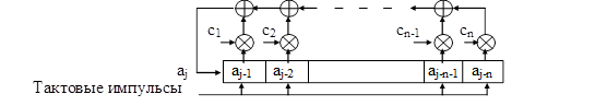 где аi – состояния разрядов регистра. Коэффициенты сi , принимающие значения 1 и 0, указывают номера разрядов, подключенных к логической схеме в цепи обратной связи. Суммирование выполняется по модулю 2. На регистр устанавливают начальный код и подают тактовые импульсы.