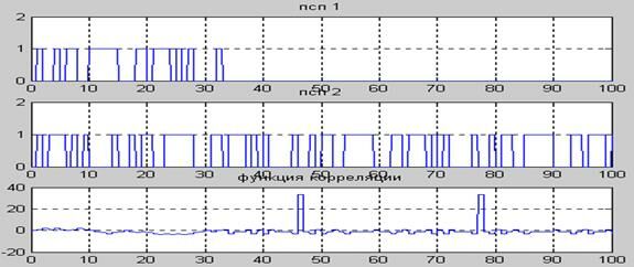 g(x)=x5 + x2+1.Периодические ФАК m-последовательностей идеальны.  На осциллограмме показана последовательность периода 31: исходная (один период) и сдвинутая (три периода), полученная на модели генератора ПСП. Вычисление функций корреляции начинается после завершения формирования ПСП, т.е. на втором и третьем периодах ПСП. ФАК имеет максимум величины 31, боковые лепестки ФАК равны 0 или -1.