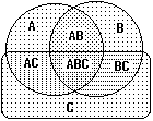 На рис. 8.2.6 на примере трех пространств можно видеть причины появления в выражении (8.2.9) дополнительных сумм вероятностей совпадающих пространств и их знакопеременности. При суммировании вероятностей пространств А,В и С, имеющих общее пространство АВС, его вероятность суммируется трижды, а при вычитании вероятностей перекрывающихся подпространств АВ, АС и ВС трижды вычитается (т.е. обнуляется), и восстанавливается дополнительным суммированием с вероятностью пространства АВС.