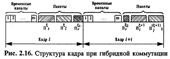 Гибридная коммутация. Цикл дискретизации при ИКМ, т.е. пропускная способность линии связи, делится на две области (рис. 2.16). При этом т временных интервалов в каждом кадре отводится для временных каналов, а оставшаяся часть — для передачи пакетов трех сообщений: Сi, Сj и Сr. В свободной от временных каналов части l-го кадра передаются x-е пакеты сообщений Ci и Cj » (пакеты