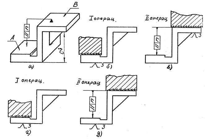 Применение правила единой технологической базы рассмотрим на примере обработки поверхностей А и В кронштейна аэрофотоаппарата (рис.5а), на котором конструктором оговорена параллельность этих поверхностей. Принцип совмещения баз диктует, например, такую последовательность обработки: обрабатывается поверхность А, затем поверхность В на базе А. Однако такая схема обработки потребует приспособления, в котором поверхность А детали надо подводить снизу к установочным элементам приспособления, что усложняет его конструкцию. В условиях отказа от совмещения баз можно предложит два варианта обработки поверхностей А и В: на разных базах (рис.5б и 5в) в две операции и на единой базе (рис.5г и 5д) тоже в две операции. При равных условиях точность обработки по второму варианту будет выше, чем по первому. на величину δ допуска размера "С", соединяющего базы детали.