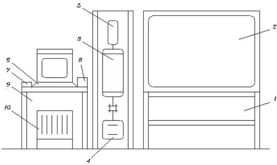 В тумбе 9 установлен крейт 10 с электронными блоками системы управления. В крейте расположена также необходимая функциональная коммутационная аппаратура. Такое расположение и конструктивное исполнение блока 10 дает возможность свободного доступа к печатным платам электронных блоков в случаях их изучения или ремонта.