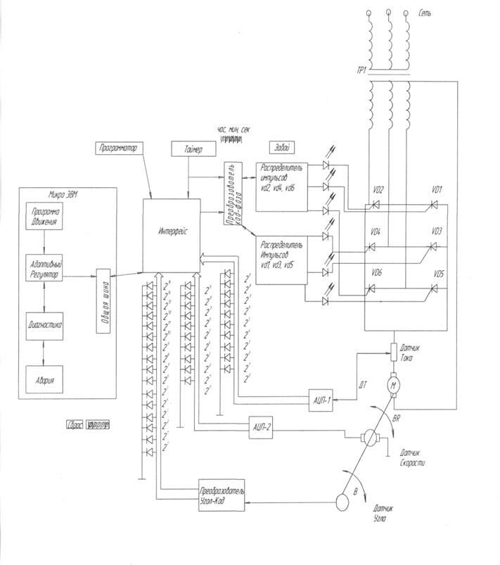 Управляющий сигнал из микро-ЭВМ выдается на преобразователь код-фаза и обрабатывается в распределителе импульсов. Далее через тиристорный преобразователь подается на исполнительный электродвигатель постоянного тока. Ошибка рассогласования между задающим устройством и обратной связью отрабатывается в цифровом корректирующем устройстве микро-ЭВМ.