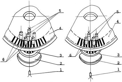 Оптическая часть содержит светодиод 1, линзу 2, растровую индикаторную пластинку 3 растровый диск 4, и фотодиоды 5.