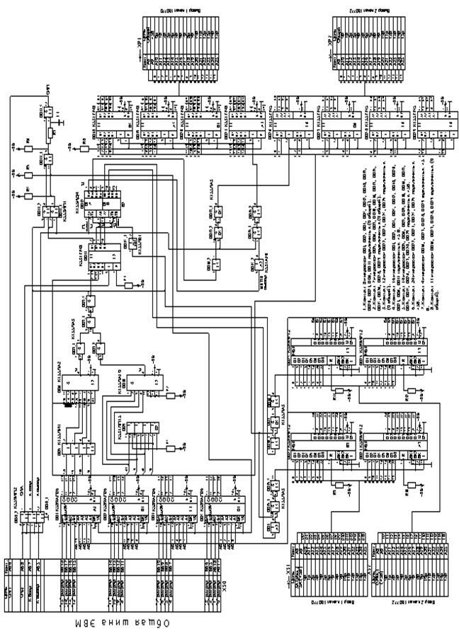 Интерфейс состоит из шести шинных формирователей ДД2—ДД5, четырех входных регистров ДД24-ДД27, восьми выходных регистров ДД16-ДД23, составного дешифратора микросхемы ДД6-ДД11, ДД13-ДД15 и формирователя ответного сигнала - ДД1, ДД12.