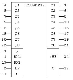 Регистр К589 ИР12 предназначен для буферизации данных, временного и электрического согласования параллельных шин в микро-ЭВМ, выполнения функции прерывающих каналов ввода/вывода информации. Запись данных Д1-Д8 регистр происходит положительным потенциалом на входе С. Чтение информации С1-С8 производится высоким потенциалом ВР. Вход Р является входом установки нуля.