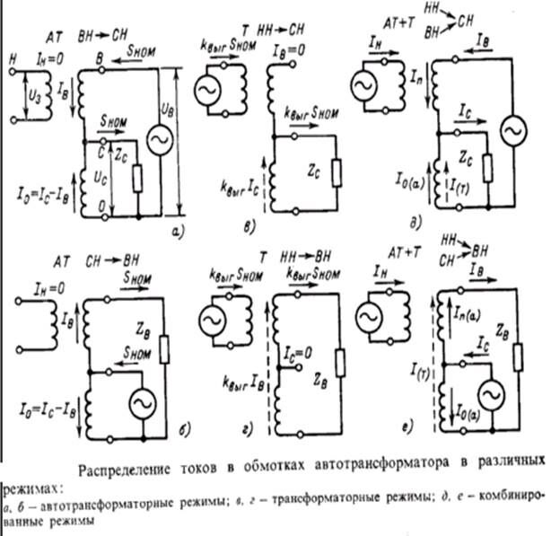 В автотрансформаторных режимах возможна передача Sном из обмотки ВН в обмотку СН или наоборот. В обоих режимах в общей обмотке проходит разность токов      Ic-Iв=Квыг×Iс, а поэтому последовательная и общая обмотки загружены типовой мощностью, что допустимо.