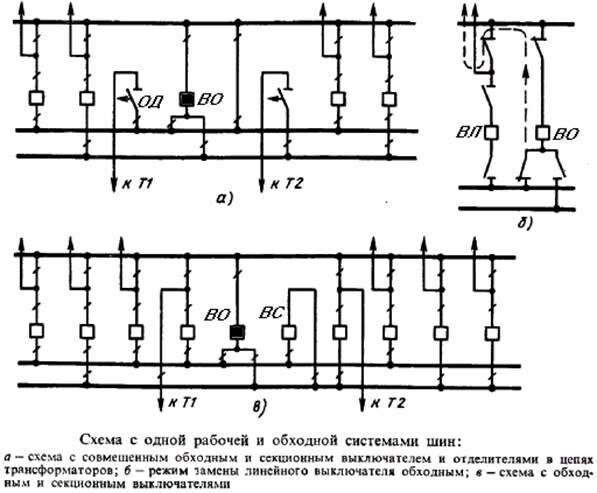 Одним из важных требований к схемам на стороне высшего напряжения является возможность ревизий и опробований выключателей без перерыва работы. Этим требованиям отвечает схема с обходной системой шин. В нормальном режиме обходная система шин находится без напряжения, разъединители, соединяющие линии и трансформаторы с обходной системой шин, отключены. В схеме предусматривается обходной выключатель ВО, который может быть присоединён к любой секции с помощью развилки из двух разъединителей. В случае ремонта любого линейного выключателя его функции принимает на себя обходной выключатель.