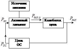 Любой автогенератор (АГ), можно представить как усилитель с обратной связью (ОС), упрощенная схема которого представлена на рисунке: