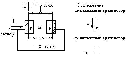 Под действием напряжения сток-исток Uси, возникает канал и ток Iс. На рис. показана структура n-канального транзистора, для p-канального p и n меняются местами. Обозначения:
