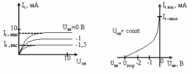 На рис. показаны типичные значения токов и напряжений. С ростом Uси ток Iс перестаёт расти, достигая насыщения Iс, нас. Его максимальное значение Iс, макс получается при Uзи=0. Транзистор закрывается при Uзи=Uпор (пороговое напряжение или напряжение отсечки).