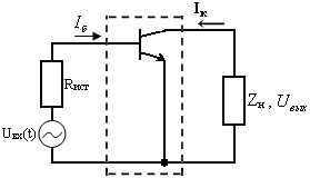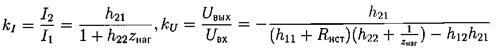 Вводя полный  импеданс нагрузки на коллекторе Zн, учитывающий Rн, Rк, Cp, C, пучим следующую схему, в которой транзистор можно описать h-параметрами четырёхполюсника, обведенного пунктиром.