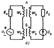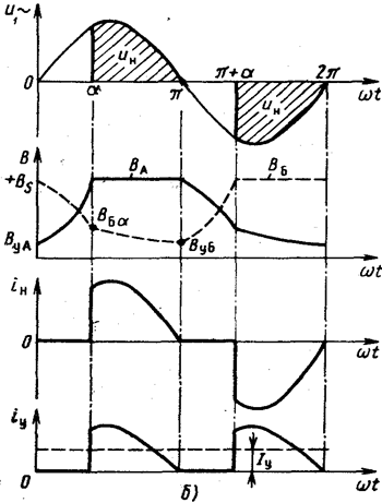 При введении в цепь управления источника напряжения перемагничивание материала магнитопровода каждого из трансформаторов будет осуществляться под действием двух источников Uiи Uy. Действие этих источников на трансформаторы А и Б можно рассматривать независимо друг от друга, так как включены они в разные цепи, а наводимые ими ЭДС в противоположных цепях взаимно уничтожаются. В результате скорости изменения магнитной индукции в магнитопроводах А и Б окажутся различными.