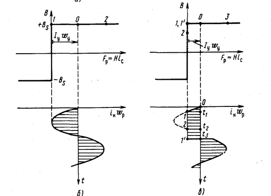 U1mwp/Rнwy, то материал магнитопровода в любой момент времени будет находиться в насыщении. Ток нагрузки будет иметь максимальное значение, а рабочая точка, характеризующая магнитное состояние материала магнитопровода, будет перемещаться по горизонтальному участку 1-0-2 ИКН (рис. 3,4,б)1.