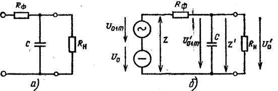 Конденсатор С, включенный параллельно нагрузке (рис. 5.1, а), представляет собой простейший емкостной фильтр. При повышении напряжения источника питания конденсатор периодически заряжается и разряжается на нагрузку, когда питающее напряжение становится меньше напряжения на его зажимах. При этом во время разряда конденсатор отдает нагрузке заранее запасенную энергию и напряжение на нагрузке изменяется в относительно меньших пределах, чем при отсутствии конденсатора, в чем и заключается сглаживающее действие емкостного фильтра.