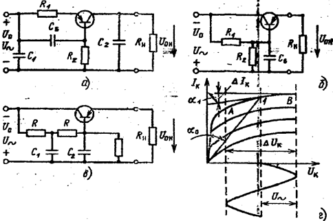 Рис. 5.7. Схемы фильтров на транзисторах (а-в), выходные характеристики транзистора (г)&#13;&#10;&#13;&#10;