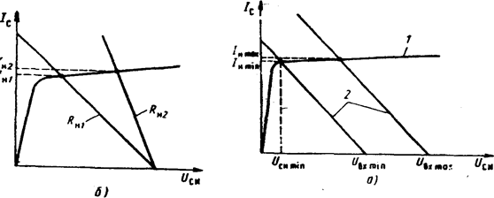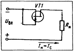 Точки пересечения нагрузочных прямых с выходной характеристикой полевого транзистора определяют ток при минимальном и максимальном значениях входного напряжения. Как видно из рис. 6.8, а, ток цепи нагрузки изменяется незначительно в широком диапазоне изменения входного напряжения.