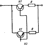 В схеме рис. 6.3 в качестве компенсирующего элемента используется обычный диод VDК или стабилитрон, включенный в прямом направлении. Такая температурная компенсация применяется для стабилитронов, имеющих положительный температурный коэффициент. Температурный коэффициент напряжения диода или стабилитрона, включенного в прямом направлении, отрицательный. При изменении окружающей температуры (например, увеличении) напряжение на стабилитроне увеличивается, а на диоде падает, в результате суммарное напряжение изменяется незначительно.