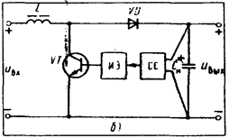 Как видно из кривой 3 рис. 6.31, КПД импульсного стабилизатора при понижении уровня выходного напряжения уменьшается, поэтому применение такой схемы в низковольтных ИВЭП нецелесообразно. Для повышения КПД при низких уровнях выходного напряжения импульсный стабилизатор (регулятор) целесообразно включать в цепь повышенного напряжения до преобразователя (рис 6.33,6).