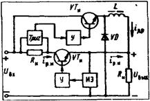 При изменении выходного напряжения изменяются сигналы на выходах ИЭ, У, УС, что приводит к изменениям тока базы регулирующего транзистора VT и напряжения на первичной обмотке трансформатора TI. В результате выходное напряжение возвращается к своему первоначальному значению.